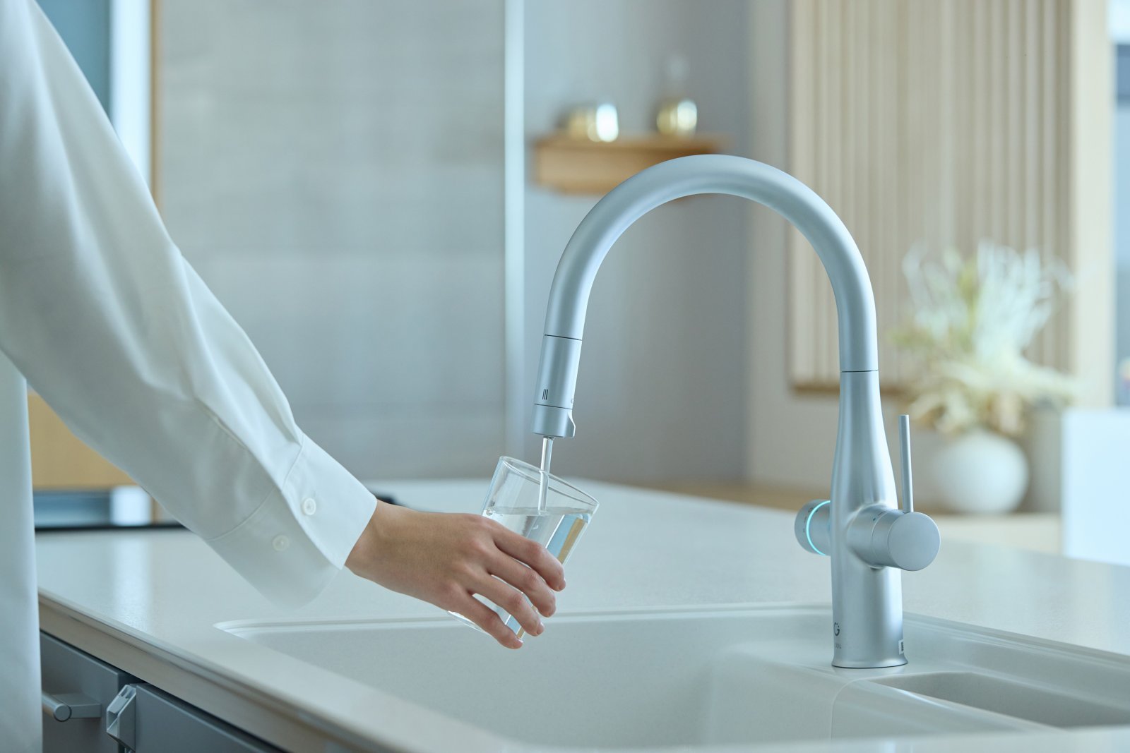 毎日の食事で家族の健康を支える大切な場所だからこそ、キッチンには使い勝手のよさだけではなく、居心地のよさ……つまりインテリアとしての美しさも求めたい。「Greentap」のシルエットは、なめらかな水を想起させる曲線と直線で構成。軽やかでありつつもエッジを効かせ、日々の暮らしにスッと馴染むスマートなデザインとなっている。なかでも新色クールシルバーはテクノロジーを感じさせる洗練されたカラーでありながら、優しさも感じられる。